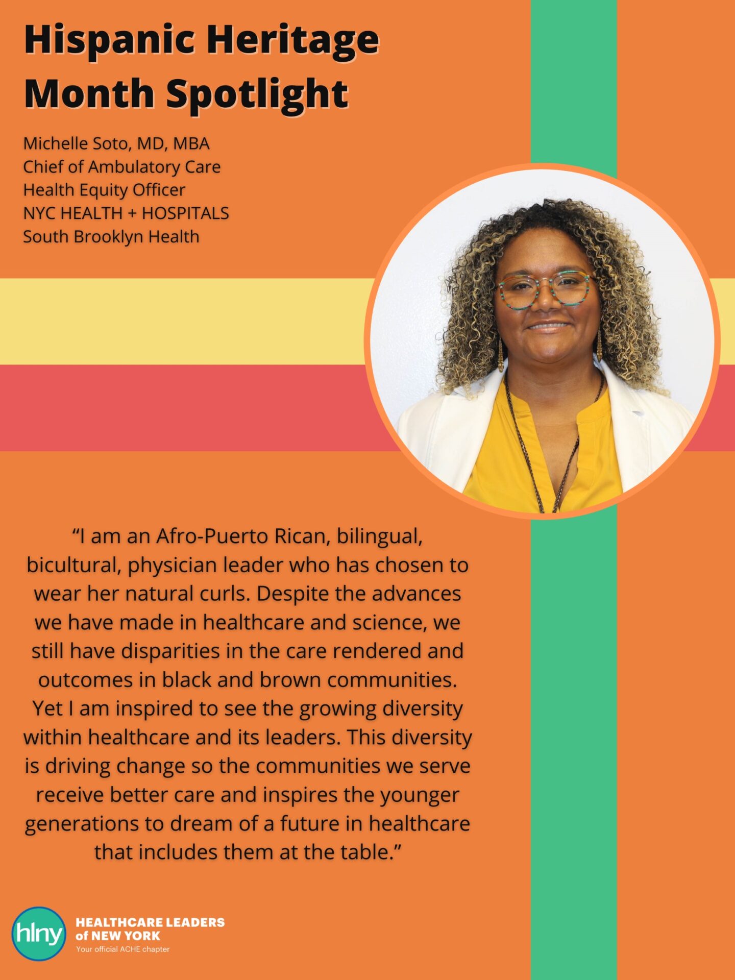In support of Hispanic Heritage Month HLNY would like to acknowledge healthcare leaders who are on the frontlines working to eliminate health disparities, increase access to care and provide resources to New York’s most vulnerable populations. This year’s theme “Latinos: Driving Prosperity, Power, and Progress in America” is focused on recognizing the significant strides of Hispanics in the economic, political, and social growth of the U.S. HLNY will spotlight health care leaders throughout the month who are making a difference in the communities they serve. We would like to start by acknowledging the work of Dr. Michelle Soto. Dr. Soto we salute you and the work you do as a diverse Healthcare Leader in New York!