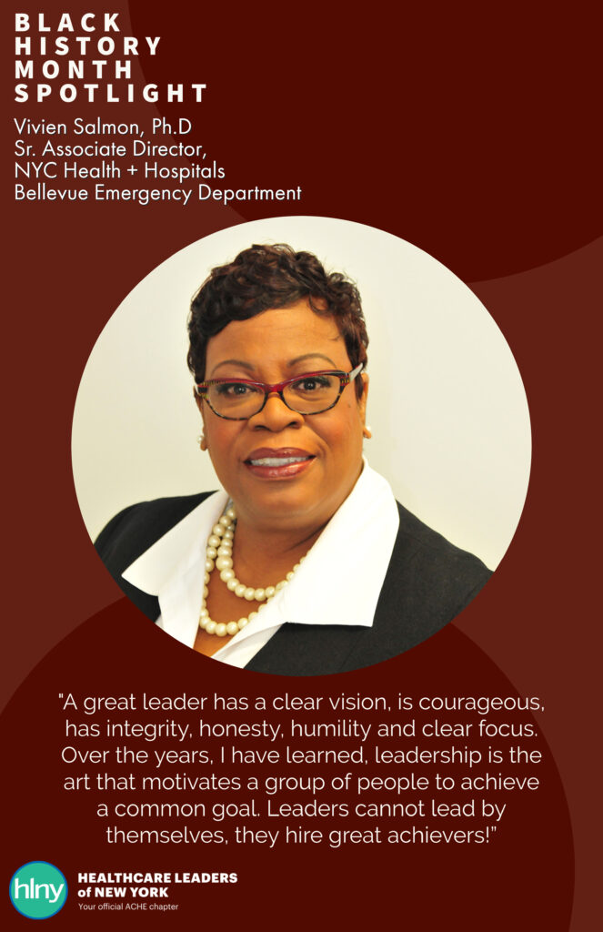 The Healthcare Leaders of New York (HLNY) Diversity Committee is excited to spotlight Vivien Salmon, Ph.D. at NYC Health + Hospitals for Black History Month. We are proud to highlight leaders making a difference both in the field of healthcare and their communities!
