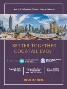Join Healthcare Leaders of New York and National Association of Health Services Executives/New York Regional Chapter for our 1st Better Together Networking event where healthcare leaders will come together to meet, reconnect, celebrate diversity, equity and inclusion in the heart of midtown NY.