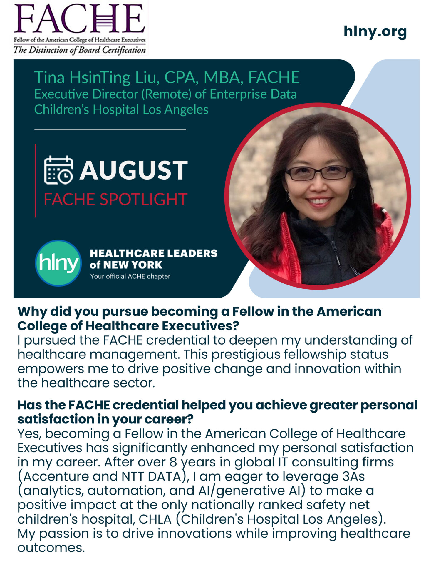Healthcare Leaders of New York (HLNY) is proud to highlight our fifth spotlight for the month as we celebrate and recognize our members who have earned the prestigious Fellow status from the American College of Healthcare Executives. We are delighted to spotlight Tina HsinTing Liu, CPA,MBA,FACHE who shares her reasons why she pursued the credential and how it has helped her career.